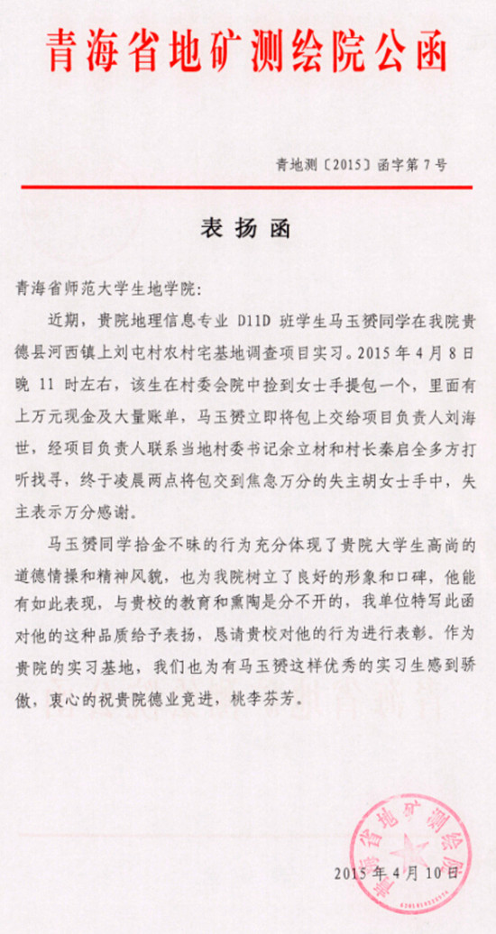 4月10日,生命与地理科学学院收到了来自青海省地矿测绘院发来的表扬函。 4月8日晚11时左右,生命与地理科学学院2011级地理信息系统专业学生马玉赟,在青海省地矿测绘院贵德县河西镇上刘屯村农村宅基地调查项目实...14 2015-04 -