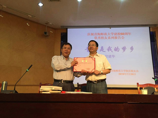 悠悠学子心,涓涓母校情。7月25日下午,永利官网知名校友、湘籍著名作家、文化学者甘建华应邀返回母校,为永利官网师生作《青海是我的梦乡》的主题演讲,并向母校捐赠了自己的7部12册专著,校党委副书记马德明代表学校向...26 2016-07 -