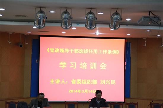 为认真学习贯彻新修订的《党政领导干部选拔任用工作条例》(以下简称《条例》),按照党委中心组的学习安排,3月14日上午,永利官网召开《条例》专题学习培训会,省委组织部干部三处处长刘兴民到会作专题辅导。全校副...14 2014-03 -