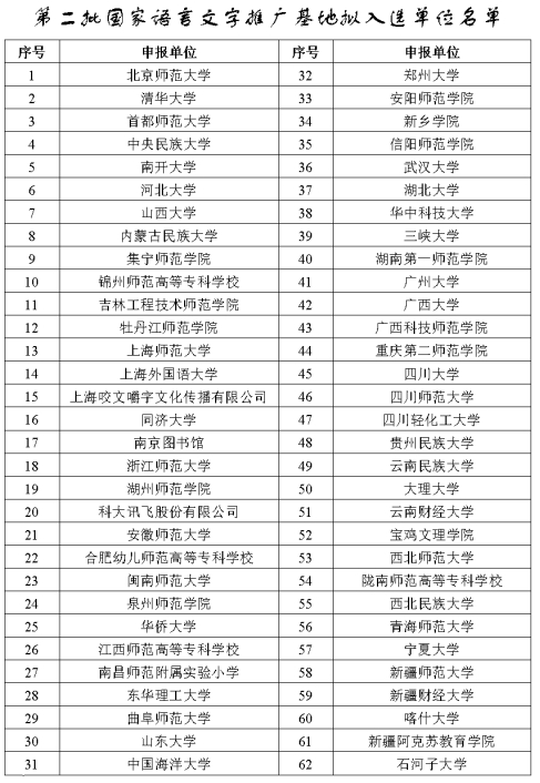 根据《国家语言文字推广基地管理办法(试行)》(国语〔2018〕3号),教育部语言文字应用管理司(国家语委办公室)组织开展了第二批国家语言文字推广基地遴选建设工作。近日,经全国各省(区、市)教育行政部门审核推荐、专家评审、实地考察、综合评议等程序,确定青海师范大学等62家单位为第二批国家语言文字推广基地。