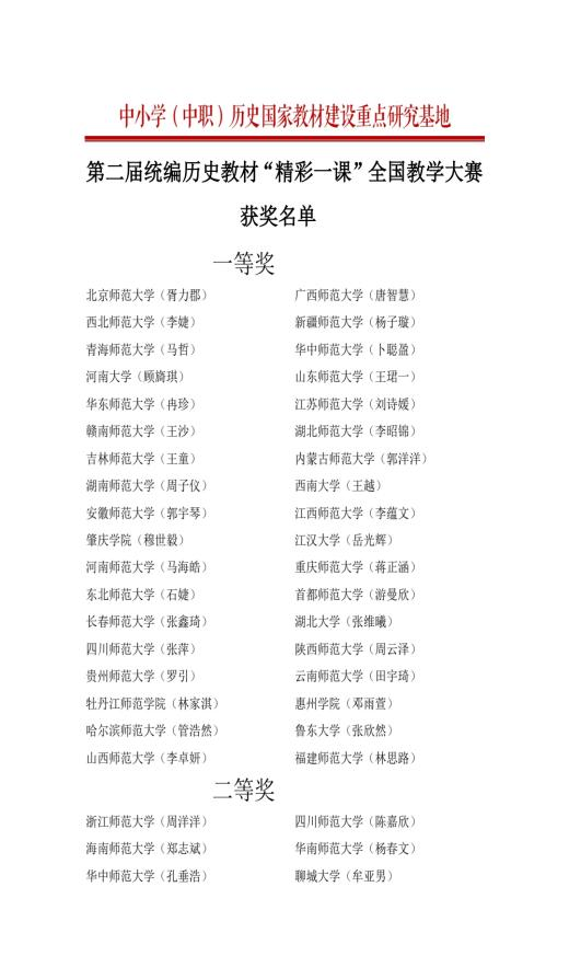 由全国中小学历史国家教材重点研究基地组织的“全国统编历史教材精彩一课”教学比赛,是目前全国高校历史专业师范生教学技能竞赛最高水平的赛事。研究基地秉持公平、公正的比赛原则,要求全国各师范院校选拔2019级本科生两名学生参赛。参赛内容为统编高中历史新教材《中外历史纲要(上)》第21课至29课中任选一课,因疫情变化,最终比赛采用递交录课及教学设计稿的线上方式进行。经双匿名(参赛学校及学生匿名、评审专家匿名)评选完成比赛。