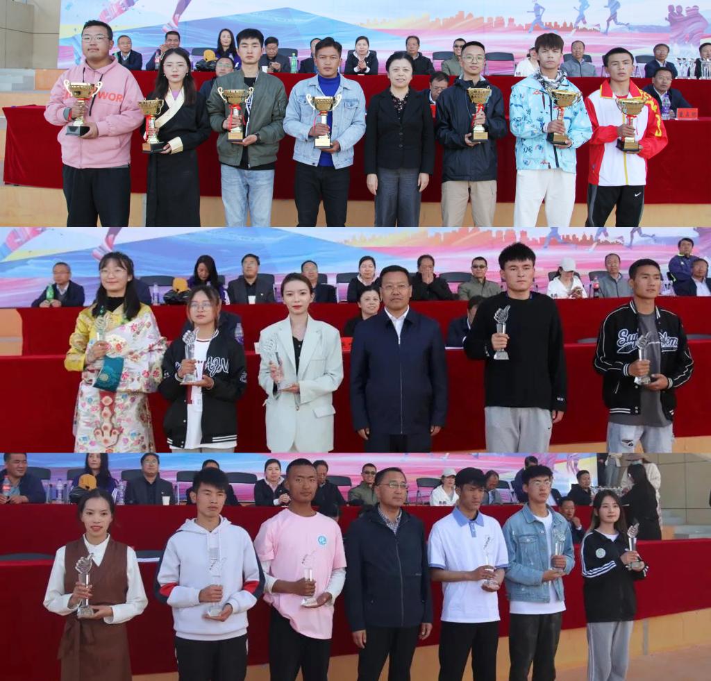闭幕式上,校纪委书记秦燕鸣宣布了体育道德风尚奖获奖单位,体育学院党总支书记冯继有宣布了田径运动会和教职工运动会竞赛成绩。此次运动会中,民族师范学院、物理与电子信息工程学院、计算机学院分获田径运动会竞赛团体总分前三名,19级运动训练班获体育学院学生组团体总分第一名,教育学院、民族师范学院、文学院、计算机学院、音乐学院、外国语学院、体育学院7个学院获体育道德风尚奖,另有一项破纪录项目,与会校领导为获奖单位颁发了奖杯。
