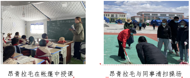 在师大老师眼中,支教的学生们还是孩子,在灾难发生的时候,害怕、恐惧甚至是逃避都是可以理解的。但是昂青同学没有选择在震后回到相对安全的果洛州久治县家中(距离震中位置454公里)。相反,面对突如其来的灾难,她克服了自己的不安情绪,坚定地留下来继续帮助学校、帮助学生,继续自己的支教实习,把学生和她的实习任务放在第一位。昂青说“我毕竟是来支教学习的,更何况这是我的职责,完成我的教学任务才是最重要的,我是通过这种想法来克服自己想回家的念头。”