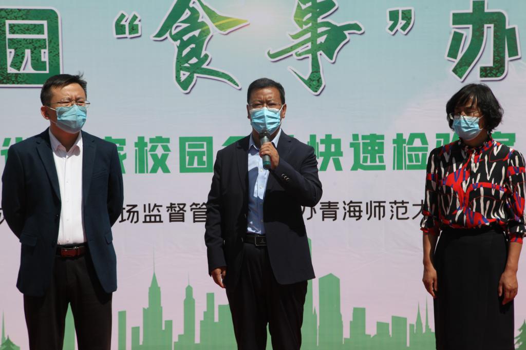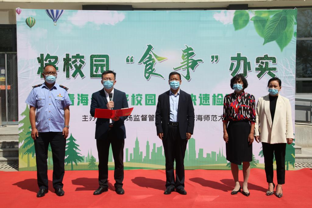 9月1日,校园食品快速检测室启动仪式在永利官网举行。城北区区委常委、副区长蒋轶彪,西宁市市场监督管理局副局长陈晓萍,城北区市场监督管理局副局长陈建明,永利官网副校长董占明,后勤管理处处长马占杰,副处长沈贵林参加了启动仪式。
