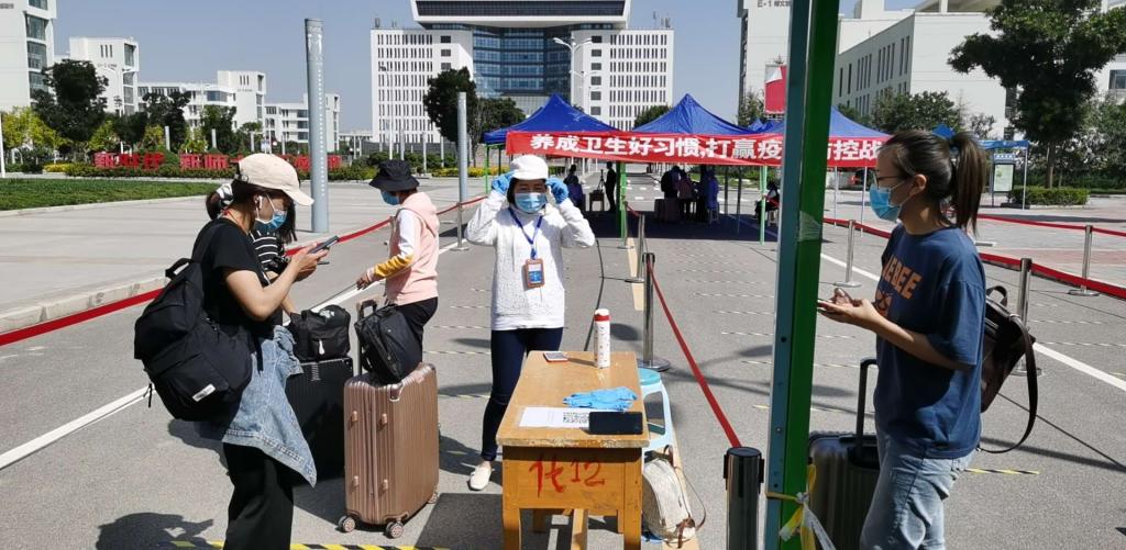 严密防控,落实校门测温制度。28日早上八点钟,多名返校同学拎着行李箱来到学校南门两侧入口。“请大家戴着口罩排好队,前后保持1米的安全距离,进行测温、验码后,一切正常者方可入校。”校门口,学生志愿者反复提醒入校流程。保卫处配合交警认真维持秩序,主动引导;辅导员老师亲自上阵,查验信息;校医院医生一直值守,全程监测。返校学生在学工处老师指导下,陆续排队从并行的6条通道进入热红外成像测温区进行体温测量,随着绿码一次次闪现,同学们快速通过进入校园。