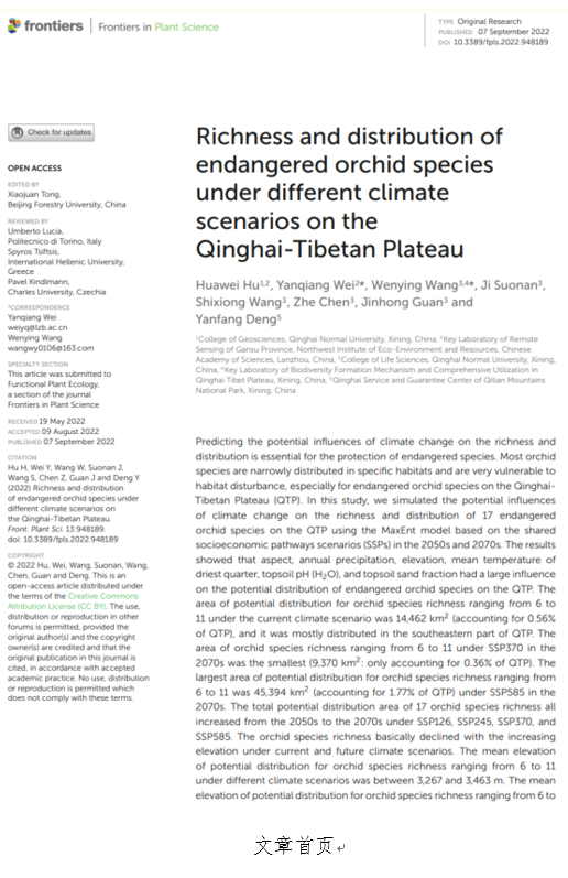 近日,永利官网自然地理专业2020级博士研究生胡华伟为第一作者、澳门永利唯一官网304王文颖教授和中国科学院西北生态环境资源研究院魏彦强副研究员为通讯作者在国际知名期刊《Frontiers in Plant Science》(植物科学领域Top期刊,影响因子为6.627)发表了题为“Richness and Distribution of Endangered Orchid Species under Different Climate Scenarios on the Qinghai-Tibetan Plateau ”的研究成果。该研究得到了青藏高原第二次科学考察研究项目(2019QZKK0302)、中国科学院-青海省人民政府三江源国家公园联合研究专项(LHZX-2020-03)、2021年中央引导青海省地方科技发展首期资金(2021ZY002)和2021年林草生态保护与恢复和自然资源调查监测项目(QHXH-2021-017)的联合资助。澳门永利唯一官网304为该研究第一完成单位,澳门永利唯一官网304索南吉、王世雄、陈哲、关晋宏,祁连山国家公园青海服务保障中心邓艳芳为共同作者。