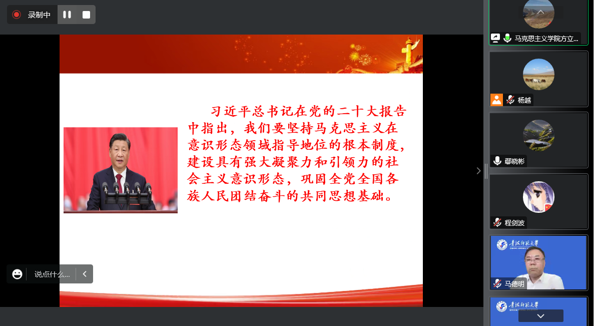 会议集体学习了二十大报告中“推动绿色发展,促进人与自然和谐共生”“推进国家安全体系和能力现代化,坚决维护国家安全和社会稳定”部分内容和原中央政法委书记郭声琨的理论文章《推进国家安全体系和能力现代化》。法学与社会学学院院长马旭东、历史学院党总支书记鄢晓彬、马克思主义学院院长方立江、学生工作处处长周晶、校纪委副书记齐志强紧扣会议主题、结合工作实际分别就高校依法治校、制度建设、纪检监察、意识形态工作等内容作了发言。