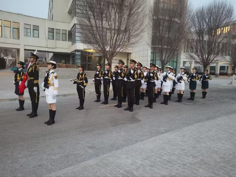 伴着破晓的星光与皑皑的春雪,国旗护卫队组成的方阵在图书馆广场西侧整齐列队,身姿挺拔,全体师生肃然静立。7点28分,队员们迈着铿锵正步将新学期的第一面五星红旗升至师范大学的上空,师生齐唱庄严豪迈的国歌。