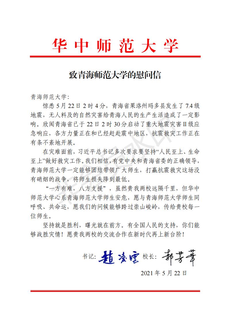 “青山一道同风雨,明月何曾是两乡”。5月22日凌晨2时4分,我省果洛州玛多县发生7.4级地震,西宁震感强烈。震情牵动了华中师范大学全体师生的心,华中师范大学党委书记赵凌雲、校长郝芳华,第一时间把全体华中师大师生对青海师大师生的殷殷关切之情,跨过崇山峻岭,穿越层层云雾,从遥远的武汉传递到了青藏高原,温暖了每一名青海师大人的心田,鼓舞了永利官网师生众志成城、攻坚克难、建设美好家园的信心和决心。