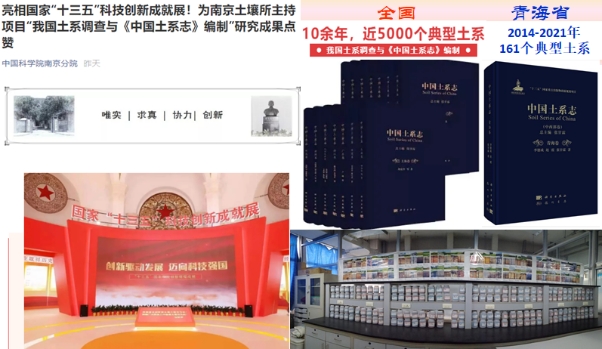 中国科学院南京土壤研究所主持的科技部基础性工作专项重点项目“我国土系调查与《中国土系志》编制”成果入选此次展出,该系列丛书是新时期我国土壤分类的标志性成果,也是各省市区土壤系统分类调查和研究的最新成果。高科院土壤信息团队李德成研究员作为第一完成人和地理科学学院赵霞副教授作为第二完成人《中国土系志·青海卷》位列其中。