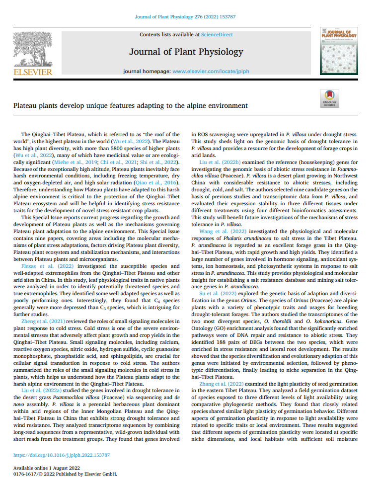 近日,国际著名植物科学SCI期刊《Journal of Plant Physiology》出版发行了《青藏高原植物多样性、与微生物相互作用及适应机制》(Plants in the Qinghai–Tibet Plateau: diversity, interactions with microorganisms, and adaptation mechanisms)的研究专刊。