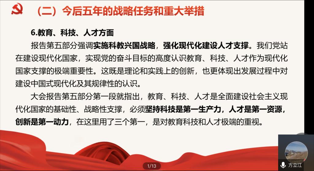 二是加强理论武装,突出学习党的二十大精神。培训班正值党的二十大胜利闭幕之际。培训班邀请马克思主义学院院长方立江教授从党的二十大的主题、过去5年的工作和新时代10年以来的伟大变革、马克思主义中国化时代化的新境界、中国式现代化、坚持党的全面领导和全面从严治党等八个方面宣讲了党的二十大精神,邀请马克思主义学院霍霞副教授从学深原著学习什么、思索重点思考什么、践行目标践履什么、悟透原理悟彻什么等方面生动讲解了《习近平谈治国理政》第四卷,集中观看了中央党校(国家行政学院)周文彰教授《学习贯彻党的二十大报告 要做到“五个牢牢把握”》专题片。宣讲报告内涵丰富、阐释深刻,讲解深入浅出、结合实际,为党支部书记和党务工作者深刻学习领会习近平新时代中国特色社会主义思想和党的二十大精神提供了权威、直接的辅导,为深刻理解把握党的二十大对教育、科技、人才的重要部署提供了思路、方法。大家表示,要持续组织党员和师生在学深悟透习近平新时代中国特色社会主义思想和党的二十大精神上下功夫,进一步增强使命感和责任感,围绕立德树人根本任务,立足培养担当民族复兴大任的时代新人,用实际行动把学习成效转化为工作成效。