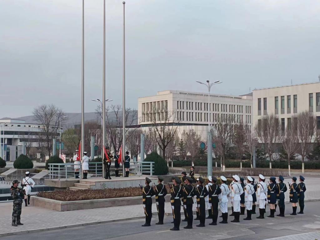 6时40分,国旗护卫队身着军礼服,昂首挺胸,踏着整齐划一的步伐,护着鲜艳的五星红旗入场。随着雄壮的国歌声响起,升旗手振臂一挥,鲜艳的五星红旗徐徐展开,伴着初升旭日的映照,国旗冉冉升起,全体师生行注目礼,高唱国歌,向国旗致以最崇高的敬意。