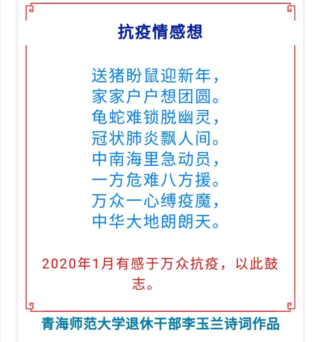 离退休老同志们以疫情防控为己任,在5个党支部的组织下,严格遵守各项防控措施,以科学的态度对待疫情,坚守家国情怀,居家创作了20余幅抗击疫情的书法、绘画、诗词等作品。老同志们纷纷表示,虽然不能冲锋在疫情防控第一线,但要寄情于笔墨,向“最美逆行者”致敬,传递我们心声,助力打好疫情防控阻击战。老同志们的作品受到省老干部局领导的好评,并在青海老干部微信公众号刊出。