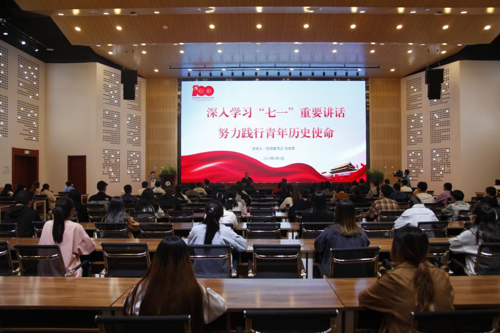 9月5日下午,校党委书记毛学荣在图书馆一楼报告厅为马克思主义学院学生讲授了题为《深入学习“七一”重要讲话 努力践行青年历史使命》的秋季学期第一堂思政课。讲座通过线上线下的方式让各学院学生共同聆听学习。