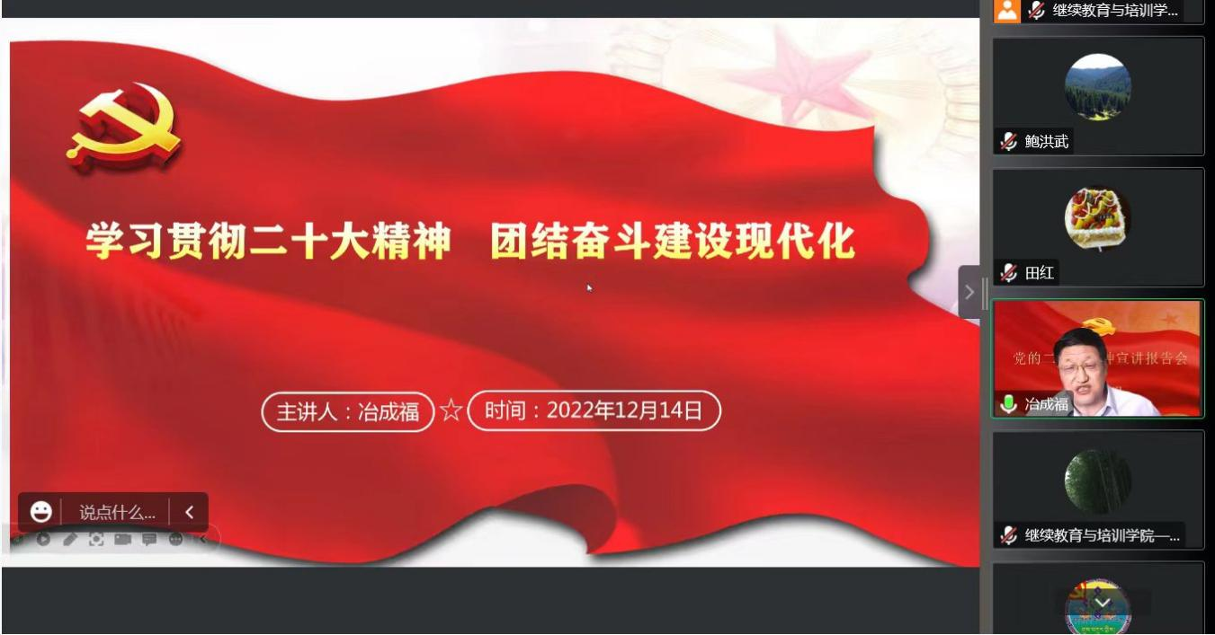 为深入学习贯彻落实党的二十大精神,根据学校统一部署,12月14日下午,校党的二十大精神领导干部巡讲团成员、副校长冶成福为继续教育与培训学院、数学与统计学院、附属玉树实验学校、校教务处作了二十大精神的宣讲报告。报告会由继续教育与培训学院副书记李芹主持。
