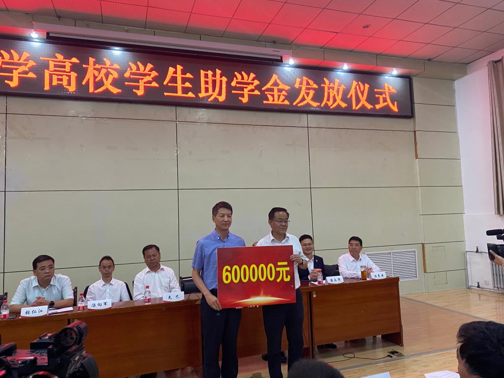 杨发玉代表省教育厅、省教育发展基金会向永利官网颁发助学金60万元捐赠牌。