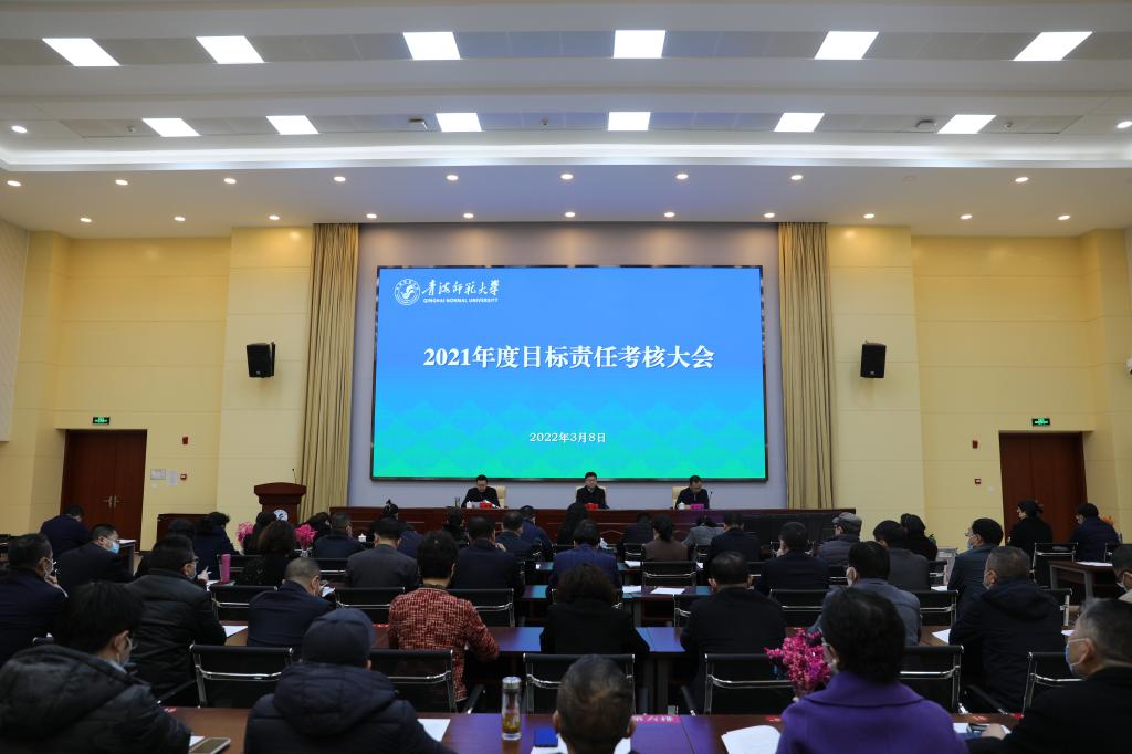 毛学荣代表学校做了《2021年度目标责任完成情况的报告》,2021年,在省委、省政府的正确领导和省委组织部、省教育厅的指导帮助下,学校坚持以习近平新时代中国特色社会主义思想为指导,以深入开展党史学习教育为契机,紧紧围绕年度重点工作,强党建、促改革,强特色、提质量,保稳定、助发展,推动学校实现了改革新突破、内涵新提升、发展新跨越。一是党史学习教育走深走实,学校各级党组织和广大党员积极践行“学党史、悟思想、办实事、开新局”总要求,推动党建思政工作取得新进展,为民办实事取得新成果。二是学校综合排名竞级显著提升,学校的综合办学实力、核心竞争力和社会影响力得到明显提升。三是新增1博4硕学位授权点,形成了4个一级学科博士点、21个一级学科硕士点,10个专业硕士学位授权,10个专业硕士学位授权类别的人才培养体系。四是六个重要论坛会议圆满成功,省委书记王建军、省长信长星为永利官网师生发来贺信,显著提升了学校的学术影响力和社会美誉度。五是课程思政建设取得新突破,加强思政理论课创新改革,坚持用红色基因教育铸魂育人取得新成果。六是科研工作刷新成绩单,省部共建藏语智能信息处理及应用国家重点实验室挂牌启动,1项科研成果荣获“2020年度青海省科技进步一等奖”,18项科研成果和团队获得青海省首届科学成果奖,各类科研项目经费总量持续保持在亿元以上。七是对口支援形成“5+9”新格局,教育部批复同意增列华中师范大学对口支援澳门永利唯一官网304,实现了对口支援的新突破。八是连续13年成功开展顶岗支教实习,有效提升了师范生的综合素养。九是科技支撑和服务社会能力迈出新步伐,积极参与果洛玛多M7.4级地震灾后评估等工作,高质量完成一系列智库报告,受到省政府和相关厅局的充分肯定。十是基本建设全面提速,3项重要建设工程顺利竣工,2项建设工程获批新建,学校办学能力不断增强。