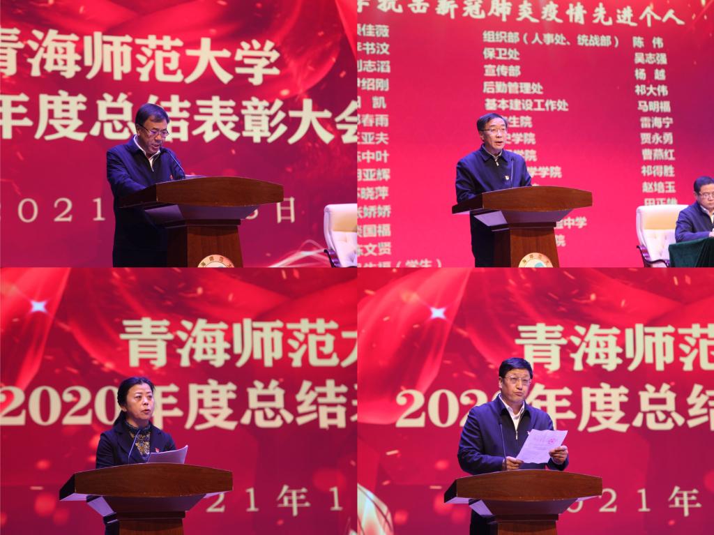毛学荣代表校党委、校行政向受到表彰的先进个人和集体表示热烈祝贺,向为抗疫斗争作出贡献的所有单位和个人表示崇高敬意。他全面回顾总结了学校“十三五”和2020年工作成绩,科学描绘了“十四五”时期的主要目标和2021年的主要工作。他指出,五年来,全校师生坚持一张蓝图绘到底,一茬接着一茬干,一棒接着一棒跑,开拓进取、追求卓越,较好地完成了重点工作目标任务,助推学校站上了发展新起点,实现了历史新跨越。一年来,全校师生凝心聚力、攻坚克难、扎实工作、开拓进取,书写了加快高质量发展的奋进之笔和华彩篇章,工作成绩可圈可点。一是聚焦“四个主体责任”,全面加强党的建设。全面细化强化了学校各级党组织在党的建设、党风廉政建设、意识形态工作、维护安全稳定工作四个方面的主体责任,着力强化思想政治教育的铸魂育人功能,党建和干部工作取得新成效,疫情防控取得重大成果。二是聚焦教学改革新方向,促进人才培养质量新提升。课程建设迈出新步伐,构建了通识育人、协同育人的新模式,卓越教师培养项目实现全覆盖,学生发展更加蓬勃有力,师范教育的主体地位和规模优势更加巩固。三是聚焦学科科研建设,发展软实力显著增强。学科建设龙头作用持续凸显,重大科研平台建设实现新突破,科研项目经费实现提质扩量,首次突破亿元大关,总量居全省高校之首,实现国家重点研发项目零的突破。四是聚焦“三院”建设,学校综合影响力不断扩展。高原科学与可持续发展研究院蓬勃发展,“两弹一星”精神研究院高位推进,青海省应急管理学院筹备有序。五是聚焦内涵建设,加快高质量发展的基础更加坚实。人事制度改革深入推进,对口支援和交流合作格局不断拓展,人才队伍建设迈上新台阶,师德师风建设持续加强。六是聚焦民生改善,着力增强加快发展的保障力。坚持以广大师生为中心的办学理念,努力改善学校办学基本条件,重点建设工程安全推进,基础教育迈出新步伐,平安校园建设坚实有力。