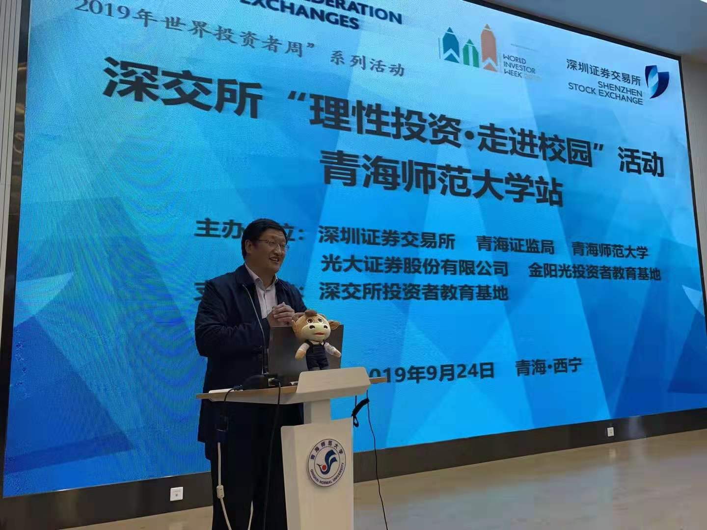 9月24日下午,由深圳证券交易所、光大证券青海营业部、澳门永利唯一官网304联合举办的“投资者丝路行(青海站)——理性投资走进澳门永利唯一官网304”活动在永利官网科技楼报告厅举行,副校长冶成福出席并致辞,学生工作处、经济管理学院相关领导及近300名师生参加了活动。