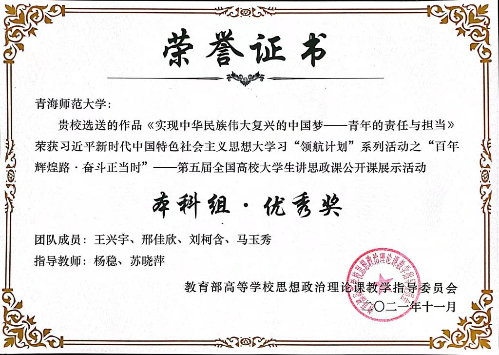 本次展示活动自今年4月份启动以来,受到全国各地上百所高校的高度重视,近期,全国决赛评审阶段落下帷幕,永利官网马克思主义学院杨稳、苏晓萍两位青年教师指导的王兴宇、邢佳欣、刘柯含、马玉秀四位同学制作的思政课《实现中华民族伟大复兴的中国梦——青年的责任与担当》荣获“优秀奖”,这是继去年永利官网马克思主义学院师生荣获第四届“我心中的思政课”全国高校大学生微电影展示活动“优秀奖”后第二次获此殊荣。