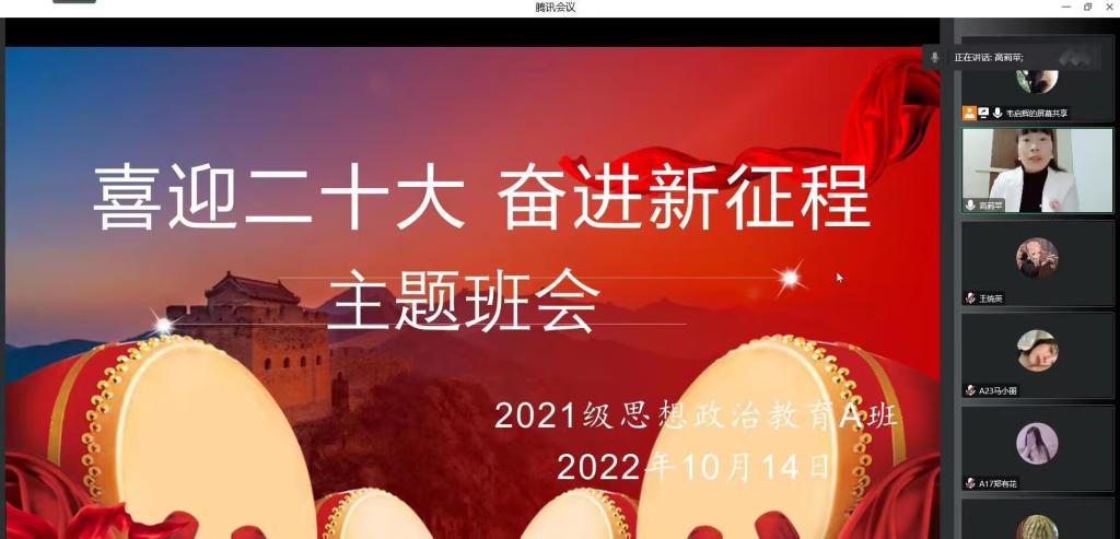 因疫情防控需要,各学院均以线上形式开展,广大学生表示,一定珍惜青春年华,努力学习,不忘初心,牢记使命,砥砺前行,用肩膀扛起如山的责任,展现出青春激昂的风采,展现出中华民族的希望。班会结束后,各班级组织观看二十大开幕式,学生积极观看,反响热烈,纷纷发表自己的感触。