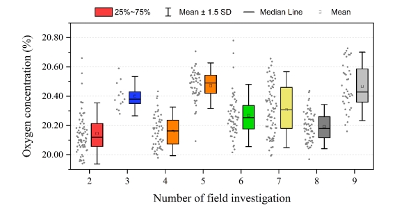 该研究通过2017-2020年连续4年的实地测量与定点观测,发现在青藏高原野外测定的氧含量值分别介于19.94%-20.66% (2018年, 样本量n= 80),19.98%-20.78% (2019年, n = 166)及 19.97%-20.73%(2020年,n = 176)之间,这与前人研究的结果在统计上存在显著差异(p < 0.001)。在青藏高原东北部祁连山区同类样点的测定结果表明,夏季平均氧含量(20.47%)比冬季(20.16%)高出0.31%。青藏高原边缘(塔里木盆地、青海湖、祁连山、横断山和云贵高原等地)的氧含量相对较高,而高原腹地的氧含量相对较低(图1)。不同野外考察路线的氧含量分布也有较大差异(图2)。该研究同时量化了青藏高原海拔、气温和植被指数(植被覆盖度、叶面积指数)的时空差异等对地表氧含量的贡献,发现海拔并不是青藏高原地表氧含量唯一决定因素,气温和植被条件等对氧含量的时空变化也产生重要影响。
