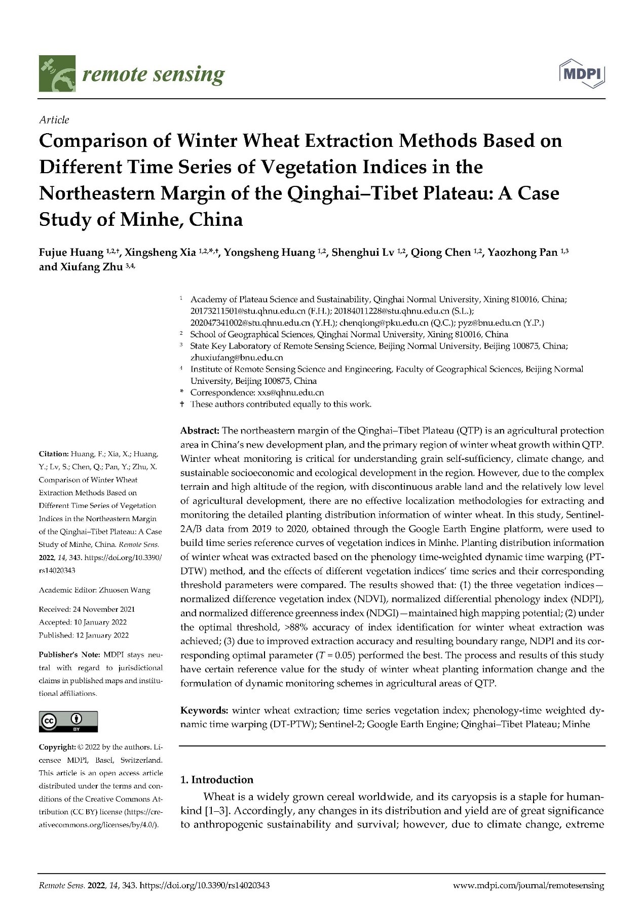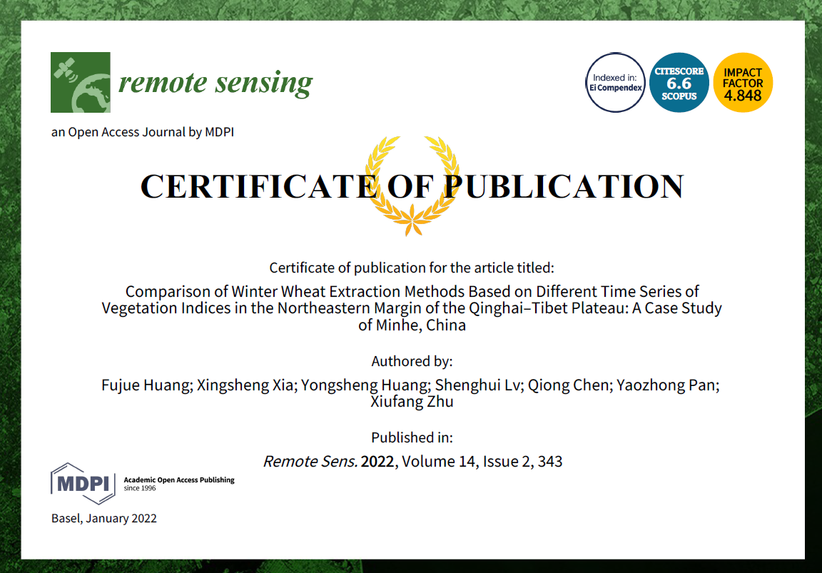近日,以高科院“高原资源环境遥感与地理信息系统”科研团队成员夏兴生博士(澳门永利唯一官网304)为通讯作者,由团队学术带头人潘耀忠教授(北京师范大学)和团队成员陈琼副教授(澳门永利唯一官网304)、团队成员朱秀芳副教授(北京师范大学)协同指导,澳门永利唯一官网304地理科学学院2017级本科生黄甫觉为第一作者完成的题为《Comparison of winter wheat extraction methods based on different time series of vegetation indices in northeastern margin of the Qinghai-Tibet Plateau:A case study of Minhe, China》的学术论文在国际SCI期刊《Remote Sensing》(中文名:遥感;JCR 1区,IF影响因子4.848)上发表。这是高科院成立以来,所属科研团队首次指导本科生以第一作者在国际JCR 1区期刊发表学术论文,充分体现了高科院支持与服务学校事业发展的初衷和宗旨,高科院科研团队助力学校教育教学,提升本科生教育成效的作用进一步凸显。