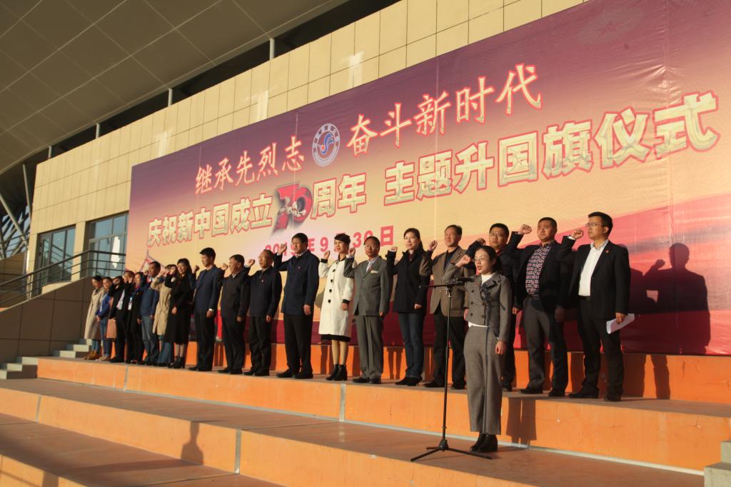 为深切缅怀革命先烈,纪念新中国成立70周年,9月30日清晨,永利官网举行了“继承先烈志,奋斗新时代,庆祝新中国成立70周年”主题升国旗仪式。校党委书记张雄伟,校党委副书记、常务副校长马德明,副校长冶成福及校办、学生工作处、团委、就业指导中心、各学院相关负责人和全校6000余名师生参加了升旗仪式。升旗仪式由学生工作处马志明主持。