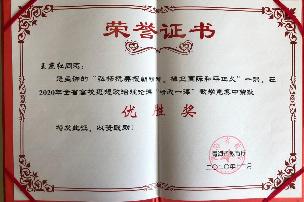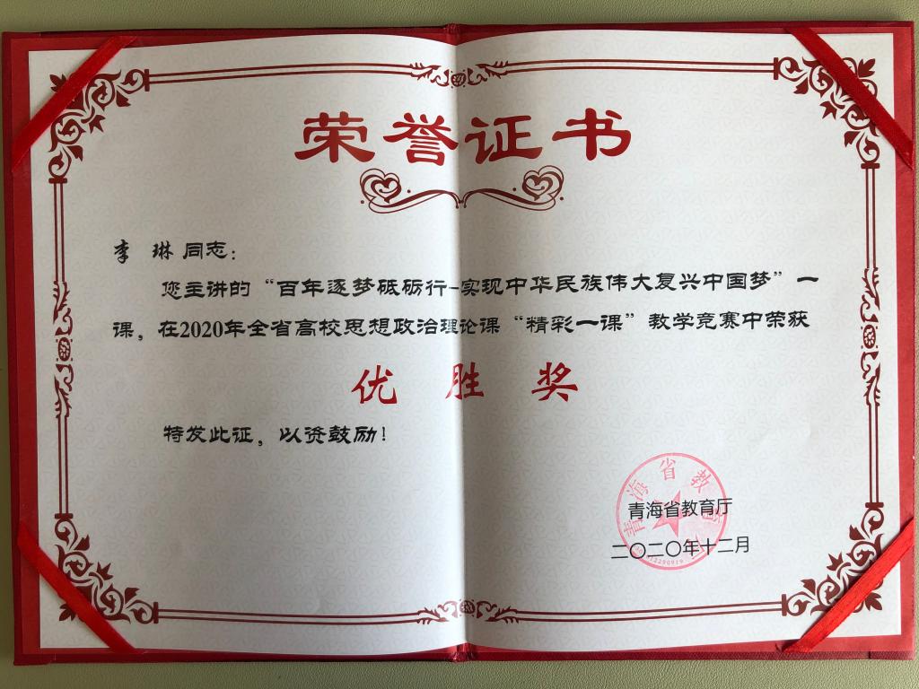 近日,青海省教育厅公布2020年全省高校思想政治理论课“精彩一课”教学竞赛结果,永利官网马克思主义学院教师李琳的“百年逐梦砥砺行——实现中华民族伟大复兴中国梦”和王燕红的“弘扬抗美援朝精神 捍卫国际和平正义”两个授课题目喜获优胜奖。