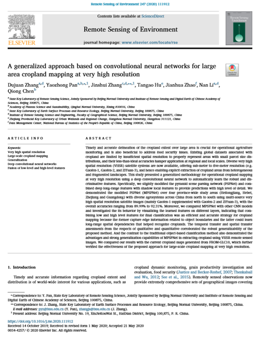 6月5日,高科院 “高原资源环境遥感与地理信息系统” 科研团队带头人潘耀忠教授和团队成员、永利官网地理科学学院教授陈琼在国际遥感领域TOP期刊《Remote Sensing of Environment》(《环境遥感》)合作发表了题为“A generalized approach based on convolutional neural networks for large area cropland mapping at very high resolution”的学术论文。该TOP期刊影响因子8.218,在国际遥感研究领域具有重要的学术影响地位。该篇科研论文的发表是高科院资源与环境研究领域取得的重要科研进展。
