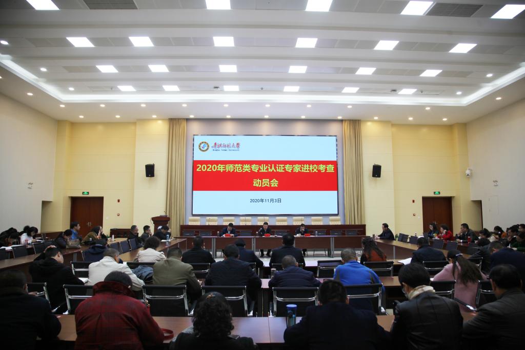 11月3日下午,永利官网师范类专业认证工作动员会在行政楼一楼学术报告厅召开。校党委书记毛学荣,校党委副书记、常务副校长马德明,副校长冶成福出席动员会。学校相关职能部门、教辅部门、师范类专业相关学院负责同志,学院教师,教务处全体人员参加会议。会议由马德明主持。