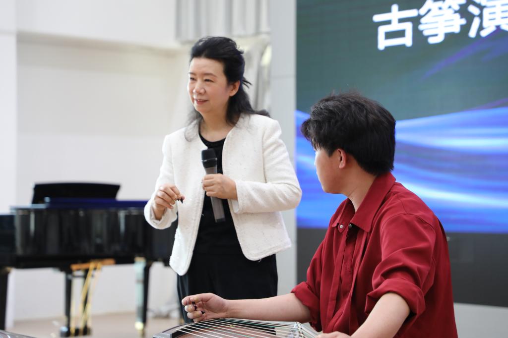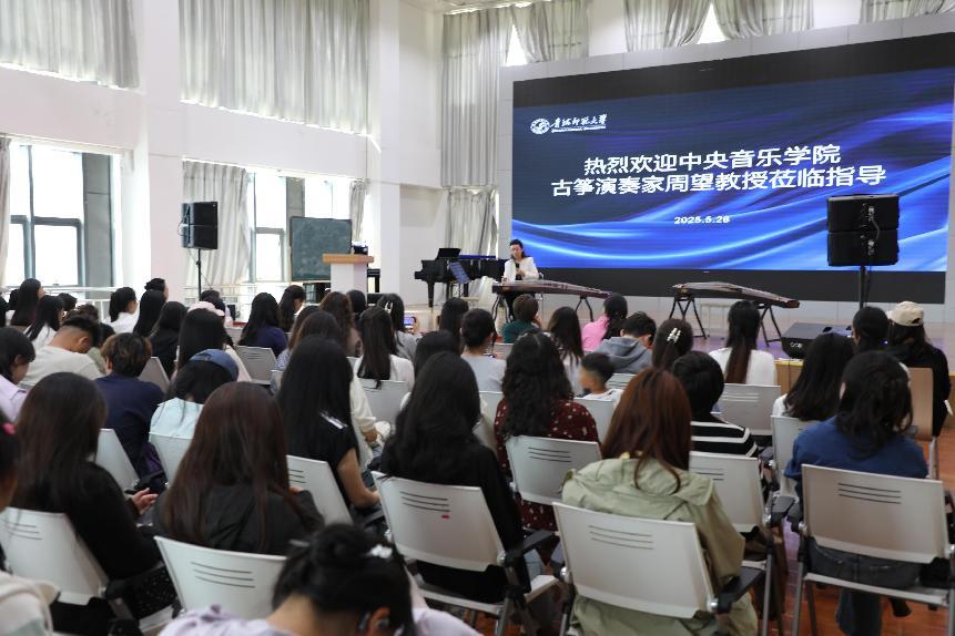 周望教授以“古筝演奏传统的当代传承”为主题,系统梳理了古筝艺术发展脉络。讲座从传统夹弹法切入,深入剖析基本功训练体系,并着重阐释左手按弦技法对音乐表现力的核心作用。她强调,传统曲目是筝乐根基,青年学子须潜心钻研经典,方能成为合格的民族音乐传承者。