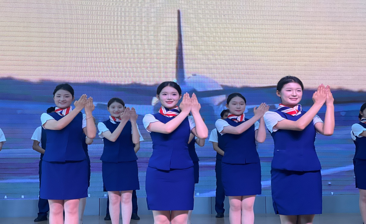 礼仪操展示环节中,同学们整齐划一的动作,优雅的引导手势,向观众传递着航空服务行业“以客为尊”的服务理念,充分彰显专业素养。