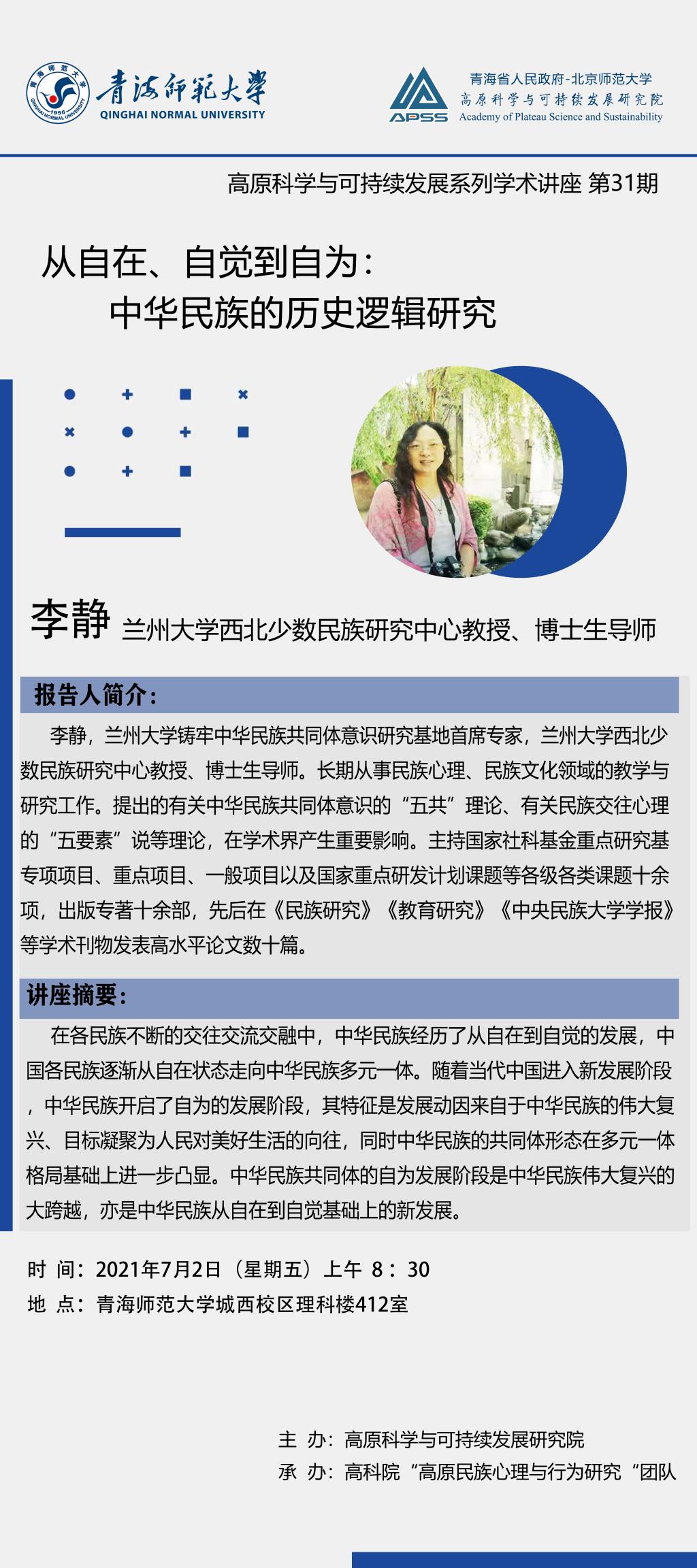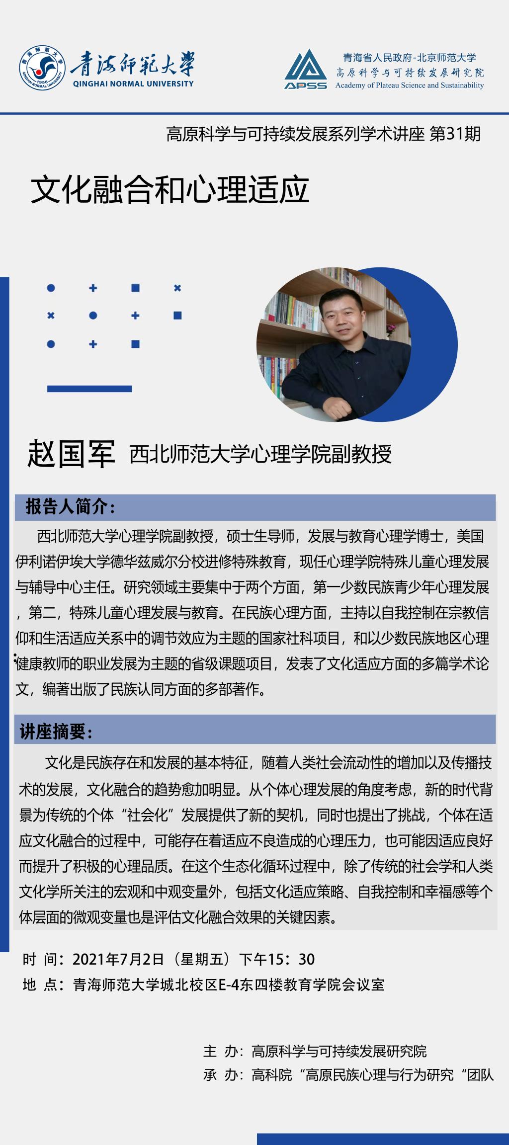 为促进永利官网心理学研究的学术交流,提升永利官网心理学研究水平,定于2021年7月2日(星期五)举办“高原科学与可持续发展系列学术讲座”(第31期),共两场。现将有关事项通知如下: