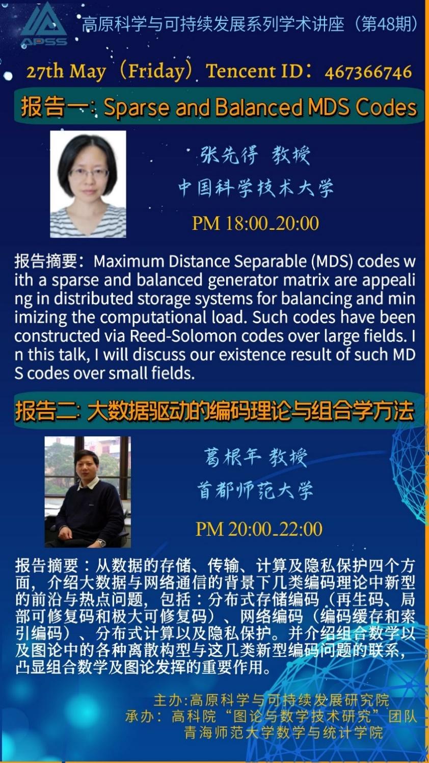 报告人简介:葛根年,首都师范大学特聘教授,教育部长江学者、国家杰青、国家百千万人才、北京学者。长期从事组合数学、编码理论、信息安全、压缩感知、数据科学等数学与信息交叉科学研究。迄今共发表SCI论文200余篇,并被SCI他引2100余次,其中:60余篇发表在国际组合数学及信息学领域内顶尖刊物 《Journal of Combinatorial Theory, Series A》、《Journal of Combinatorial Theory, Series B》、《SIAM Journal on Discrete Mathematics》、《IEEE Transactions on Information Theory》及《IEEE Transactions on Signal Processing》上。自2014年爱思唯尔(Elsevier)发布“中国高被引学者(Most Cited Chinese Researchers)”榜单以来,一直进入榜单。同时,入选美国斯坦福大学发布的“2020全球前2%顶尖科学家(World's Top 2% Scientists 2020)”榜单、美国数学会发布的“高被引数学家(Most cited mathematicians)”榜单。现任中国数学会组合数学与图论专业委员会主任、国际组合数学及其应用协会“Medals Committee Member”(全球共3人)。目前受邀担任国际组合数学界顶尖SCI期刊《Journal of Combinatorial Theory, Series A》、国际信息理论界顶尖SCI期刊《IEEE Transactions on Information Theory》、国际编码密码界权威SCI期刊《Designs, Codes and Cryptography》、国际组合设计界权威SCI期刊《Journal of Combinatorial Designs》、国际代数组合界权威SCI期刊《Journal of Algebraic Combinatorics》、国内权威SCI期刊《中国科学:数学》、国内SCI期刊《高校应用数学学报》的编委。曾获国际组合数学及其应用协会颁发的“Hall Medal”、中国青年科技奖、教育部自然科学二等奖、浙江省科学技术二等奖。