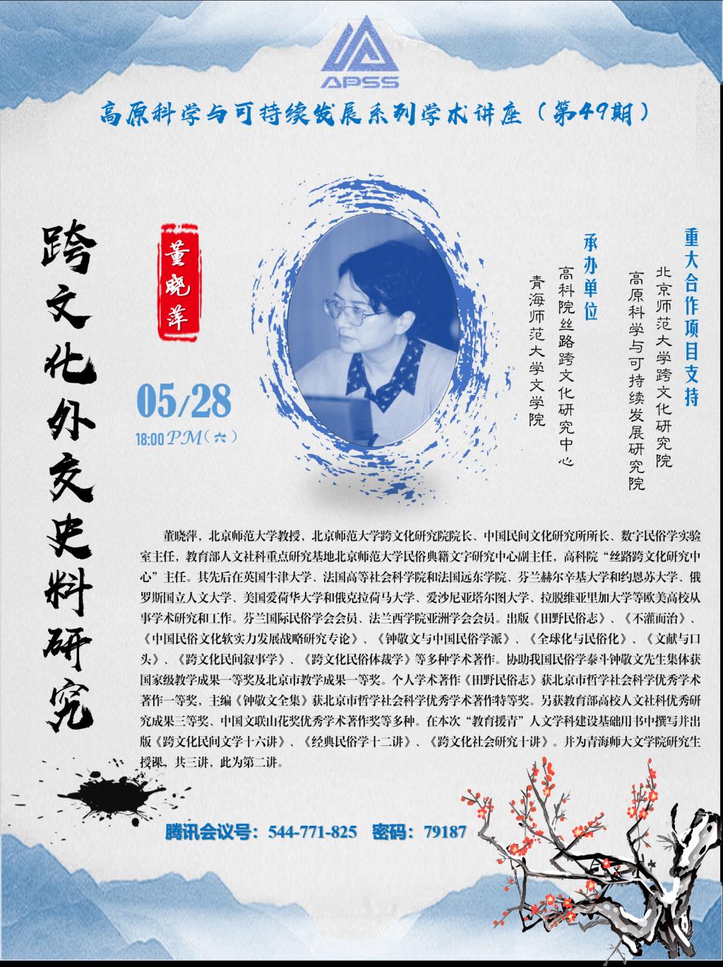 嘉宾简介:董晓萍,北京师范大学教授,北京师范大学跨文化研究院院长、中国民间文化研究所所长、数字民俗学实验室主任,教育部人文社科重点研究基地北京师范大学民俗典籍文字研究中心副主任,高科院“丝路跨文化研究中心”主任。其先后在英国牛津大学、法国高等社会科学院和法国远东学院、芬兰赫尔辛基大学和约恩苏大学、俄罗斯国立人文大学、美国爱荷华大学和俄克拉荷马大学、爱沙尼亚塔尔图大学、拉脱维亚里加大学等欧美高校从事学术研究和工作。芬兰国际民俗学会会员、法兰西学院亚洲学会会员。出版《田野民俗志》、《不灌而治》、《中国民俗文化软实力发展战略研究专论》、《钟敬文与中国民俗学派》、《全球化与民俗化》、《文献与口头》、《跨文化民间叙事学》、《跨文化民俗体裁学》等多种学术著作。协助我国民俗学泰斗钟敬文先生集体获国家级教学成果一等奖及北京市教学成果一等奖。个人学术著作《田野民俗志》获北京市哲学社会科学优秀学术著作一等奖,主编《钟敬文全集》获北京市哲学社会科学优秀学术著作特等奖。另获教育部高校人文社科优秀研究成果三等奖、中国文联山花奖优秀学术著作奖等多种。在本次“教育援青”人文学科建设基础用书中撰写并出版《跨文化民间文学十六讲》、《经典民俗学十二讲》、《跨文化社会研究十讲》。并为青海师大文学院研究生授课,共三讲,此为第二讲。