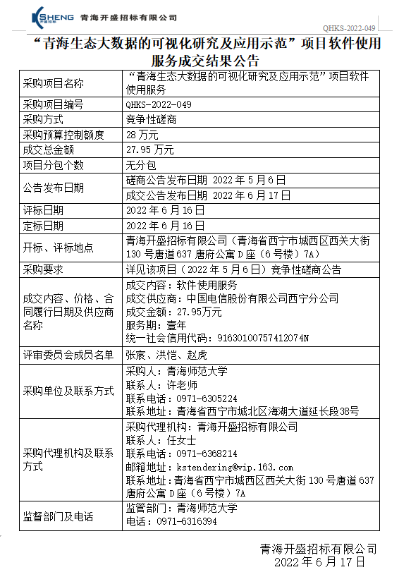 “青海生态大数据的可视化研究及应用示范”项目软件使用服务成交结果公告